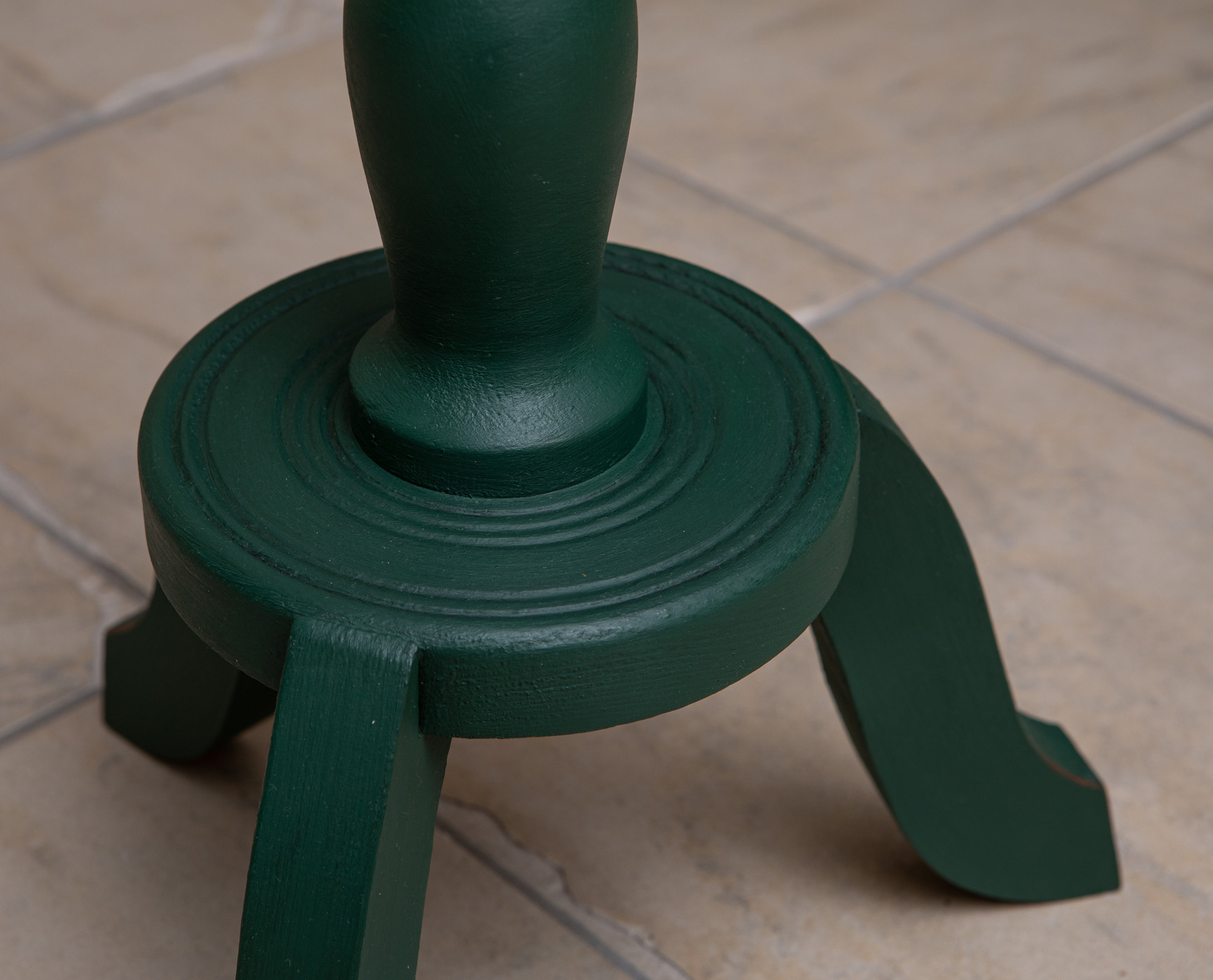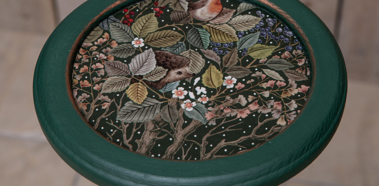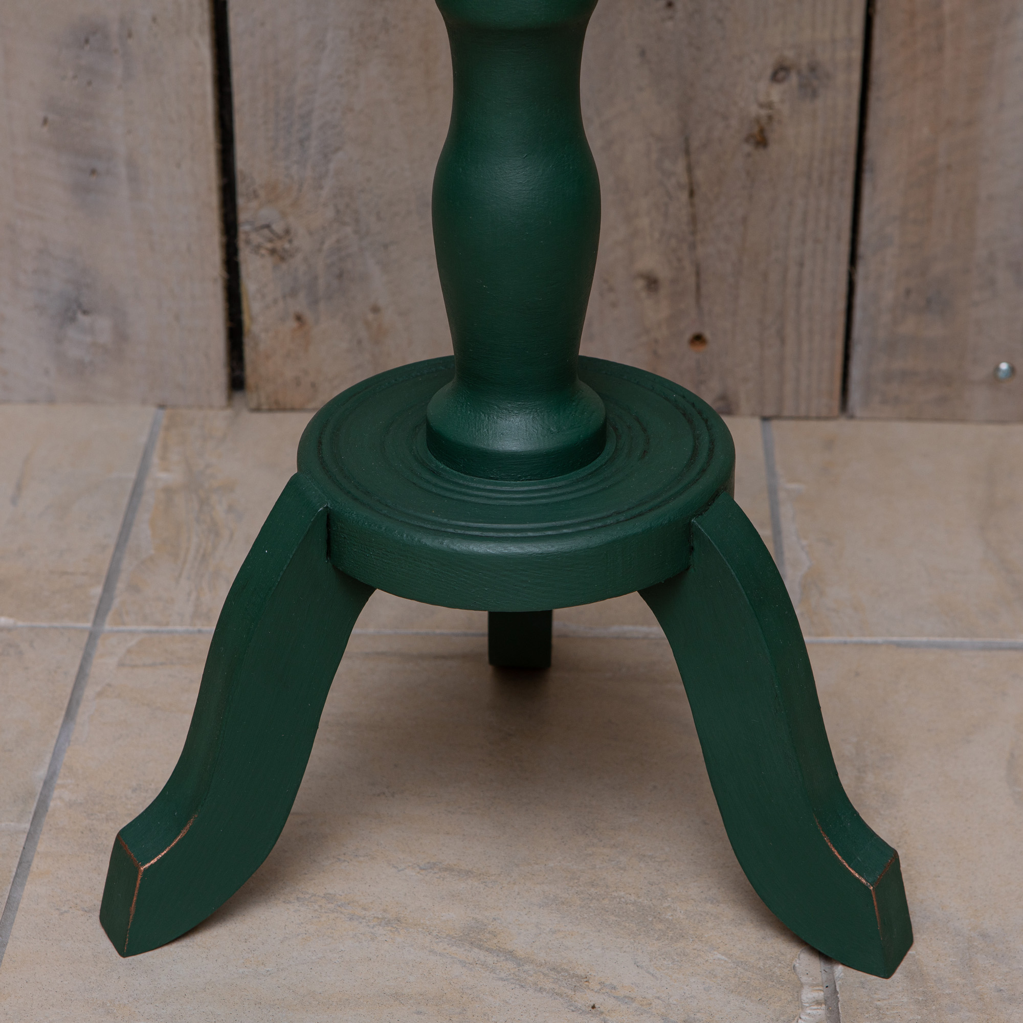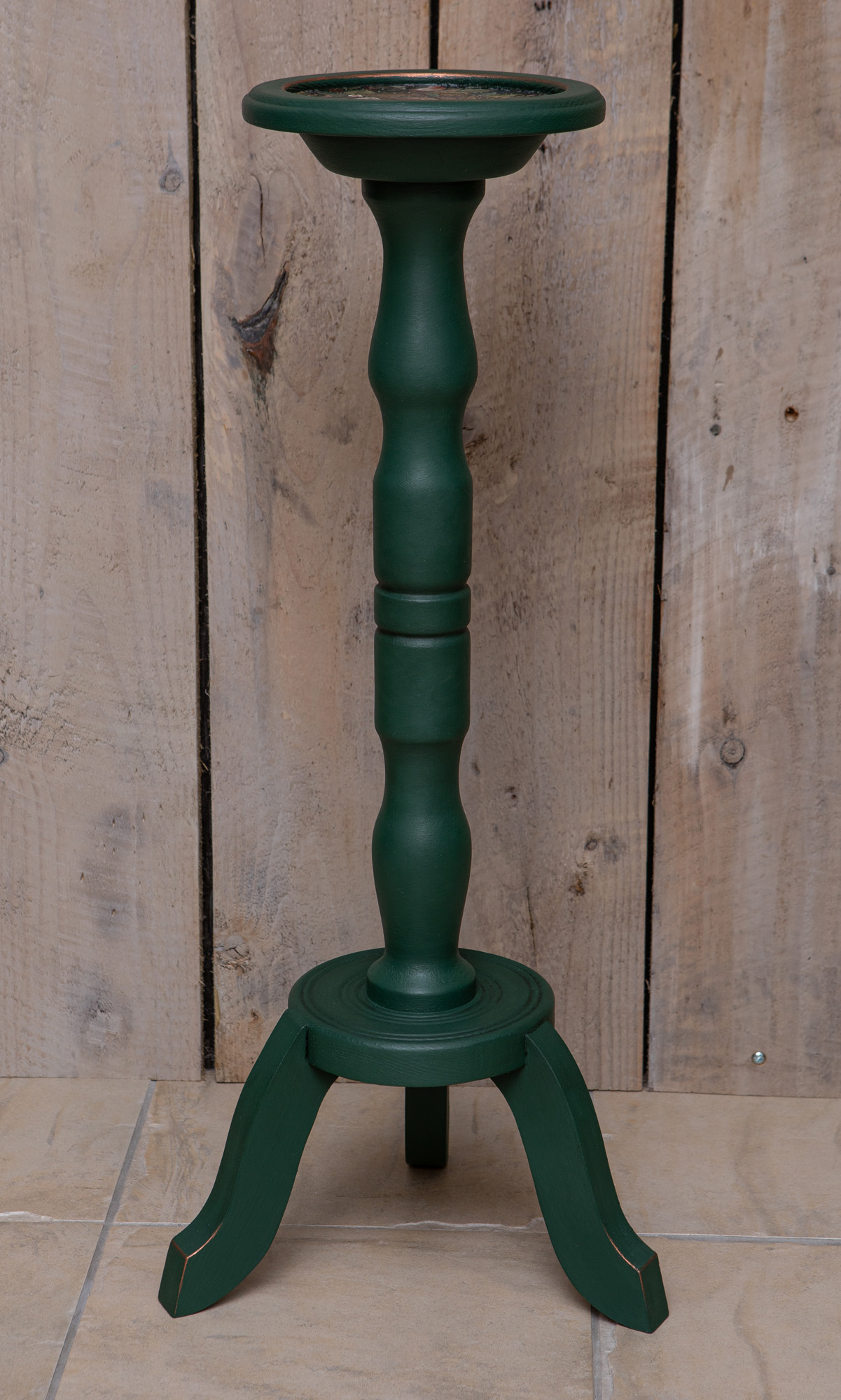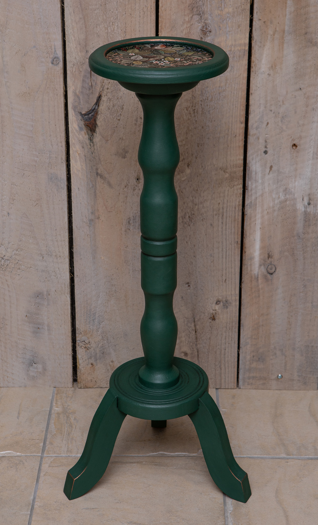 Painted in Amsterdam Green Annie Sloan chalk paint, finished with clear & black wax to protect & seal, this elegant plant stand also has gold gilt detailing. The top has been decorated with lovely Winter Woodland paper decoupage.