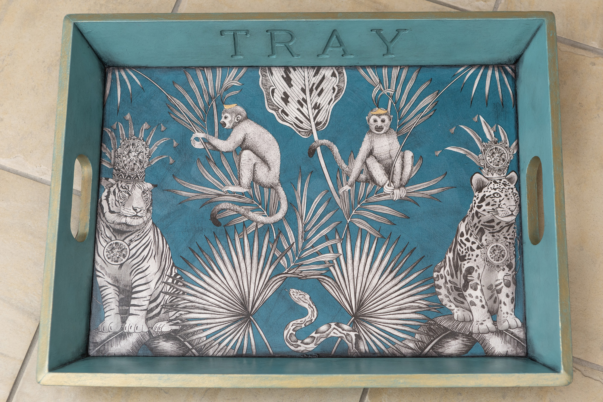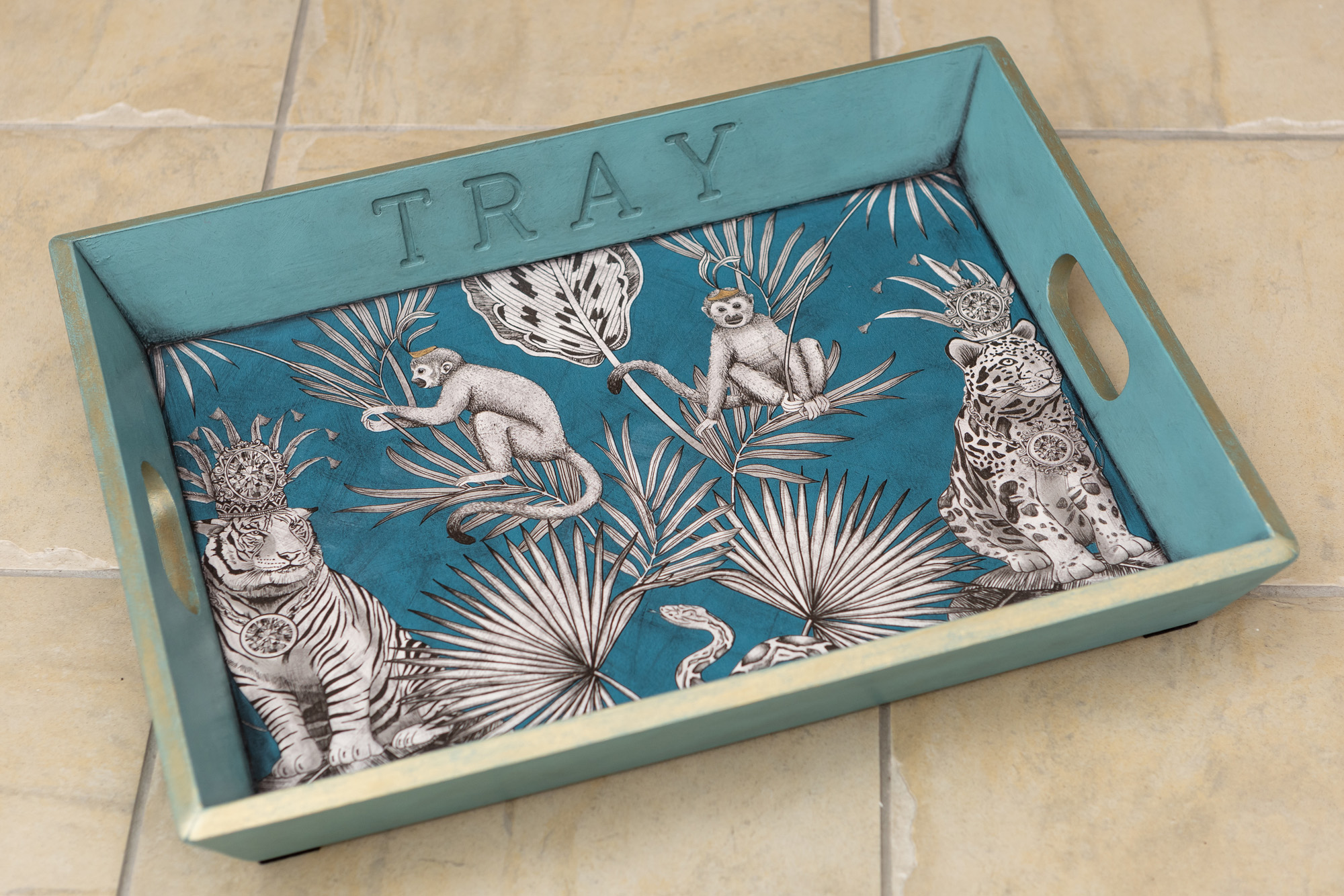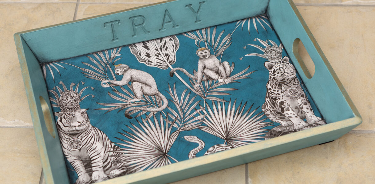 In rich Svenska blue and gilt, our crowned Capuchin monkey tray is not only functional but a talking piece too. The leafy exotic design evokes travel vibes whilst enjoying a cuppa! These cheeky chaps have now sold.