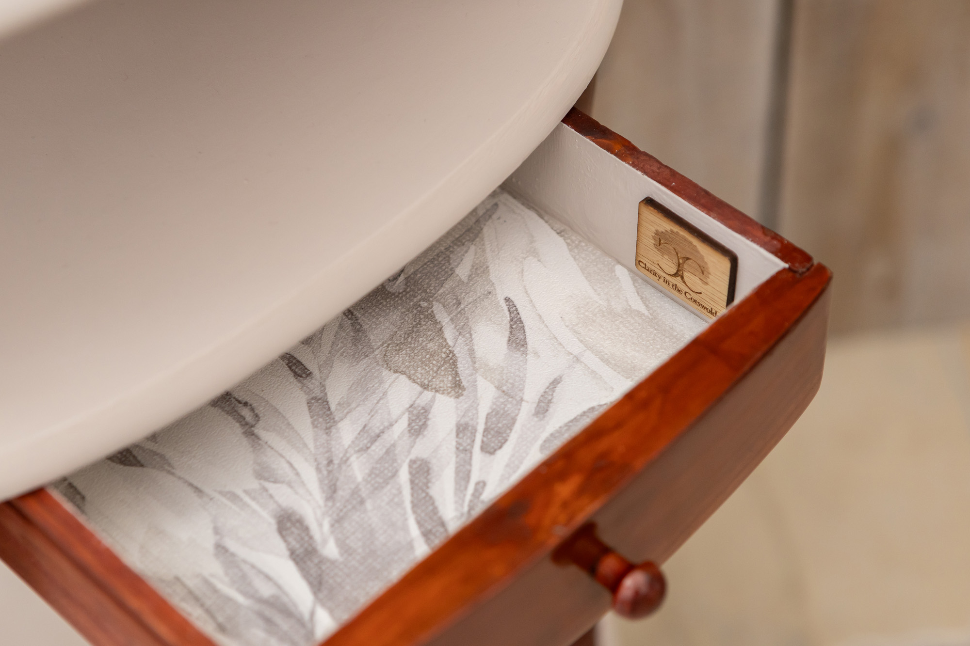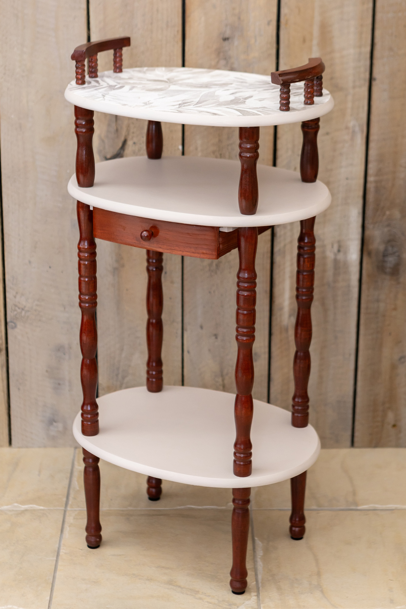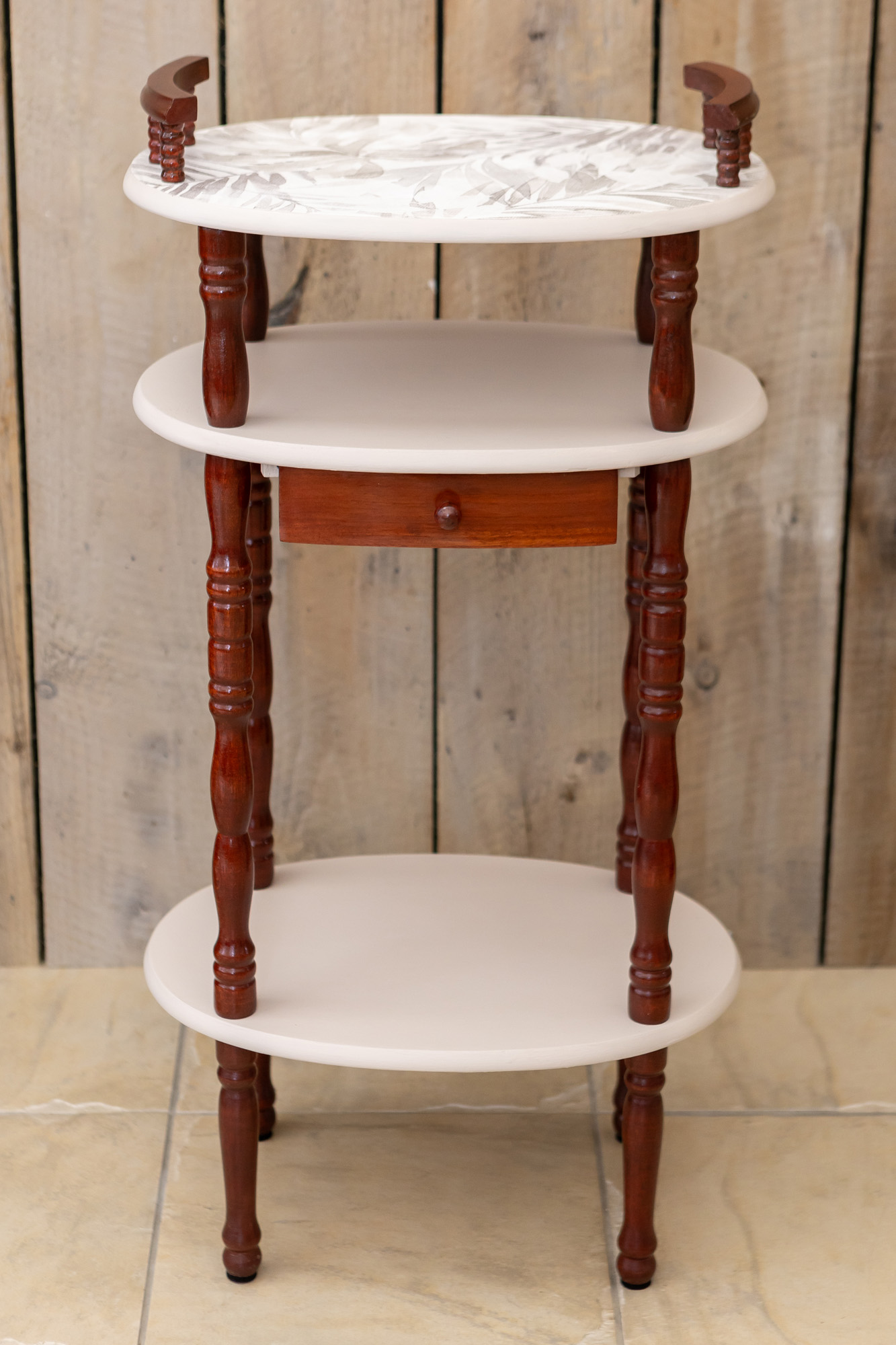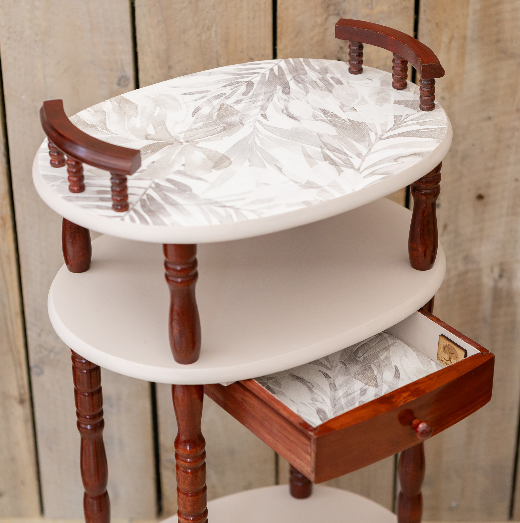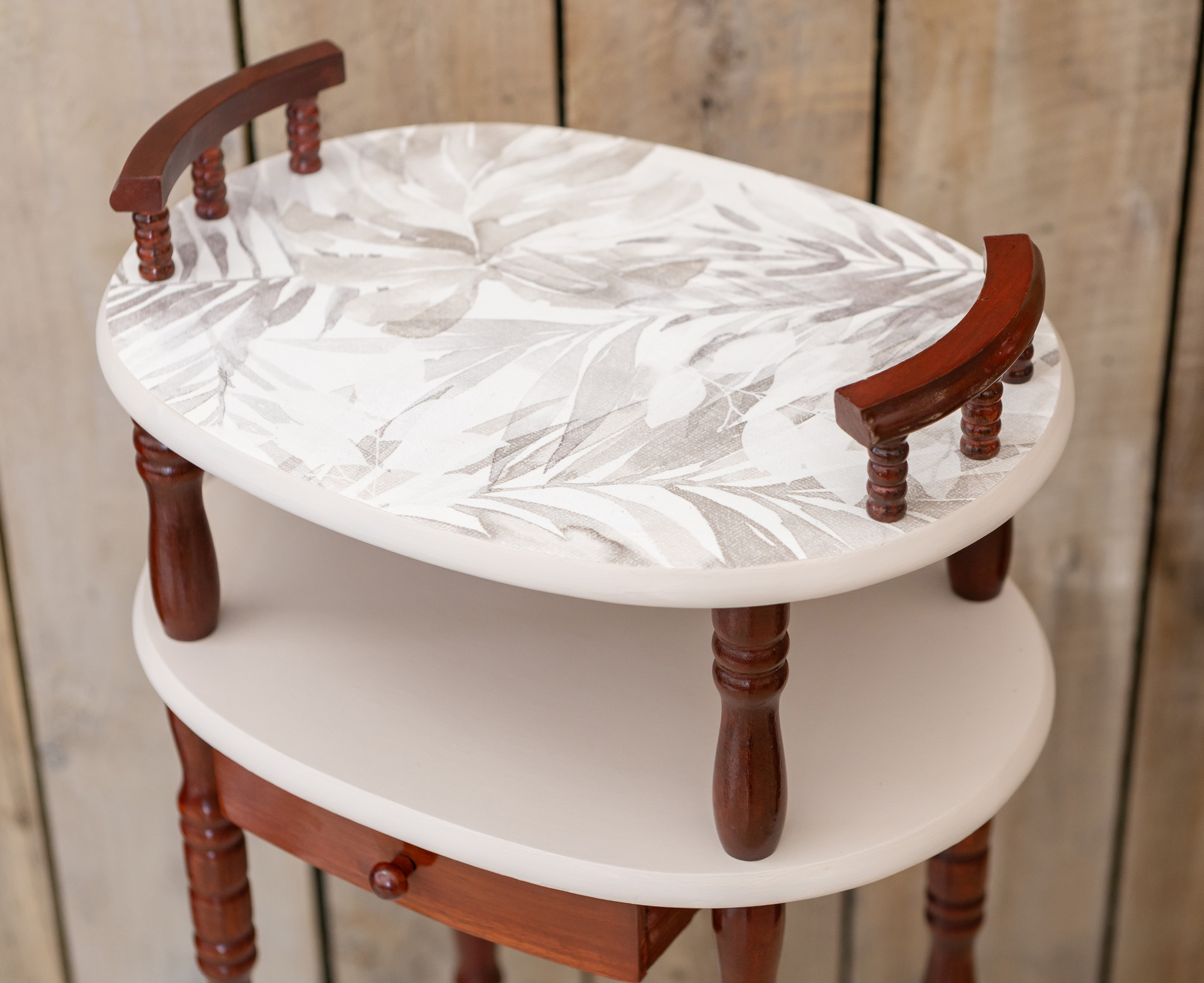 After being cleaned and additionally finished in Annie Sloan Original chalk paint that compliments the warm wood tone, we have added neutral tropical leaf decoupage that blends the palette together.
