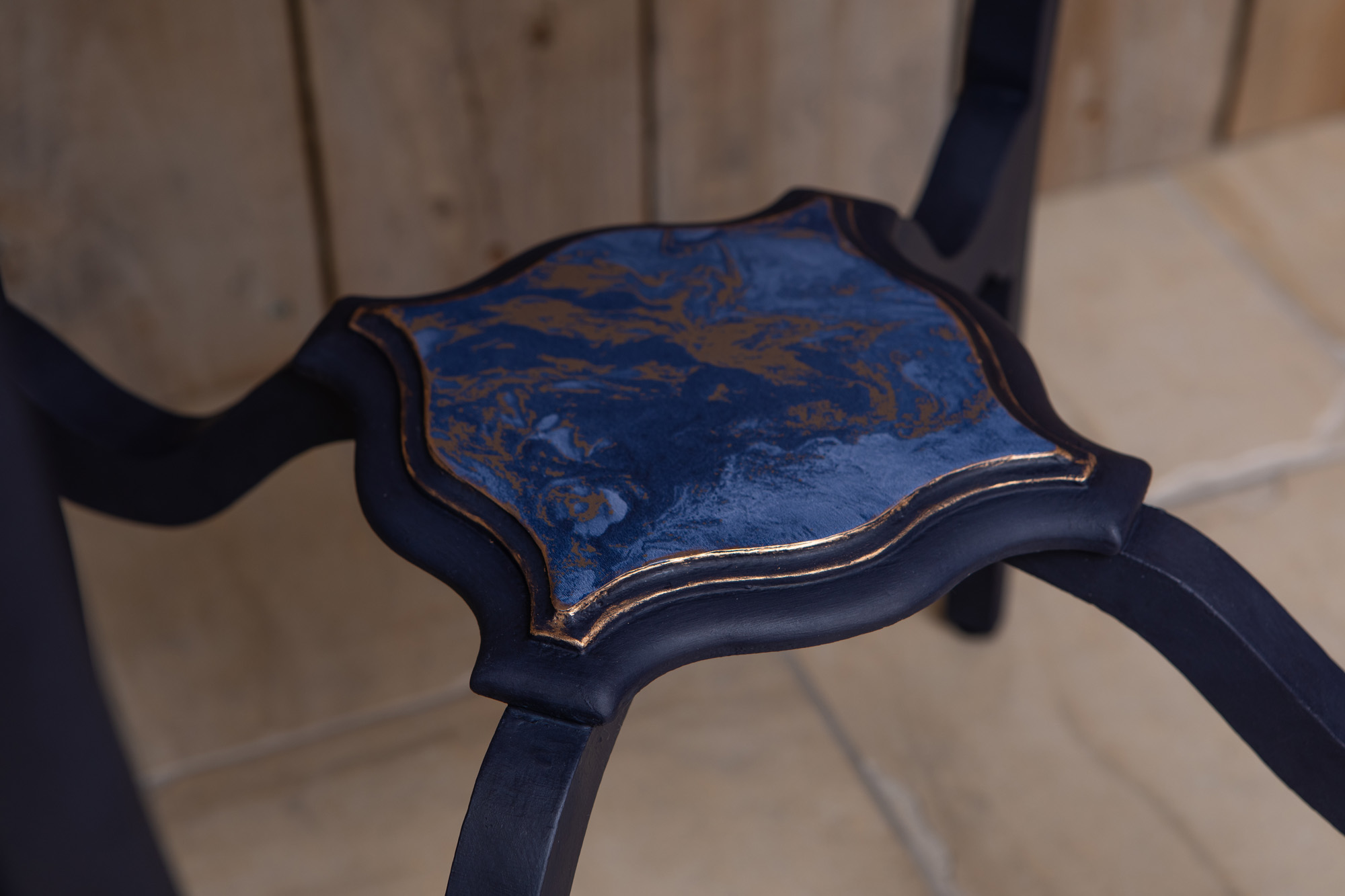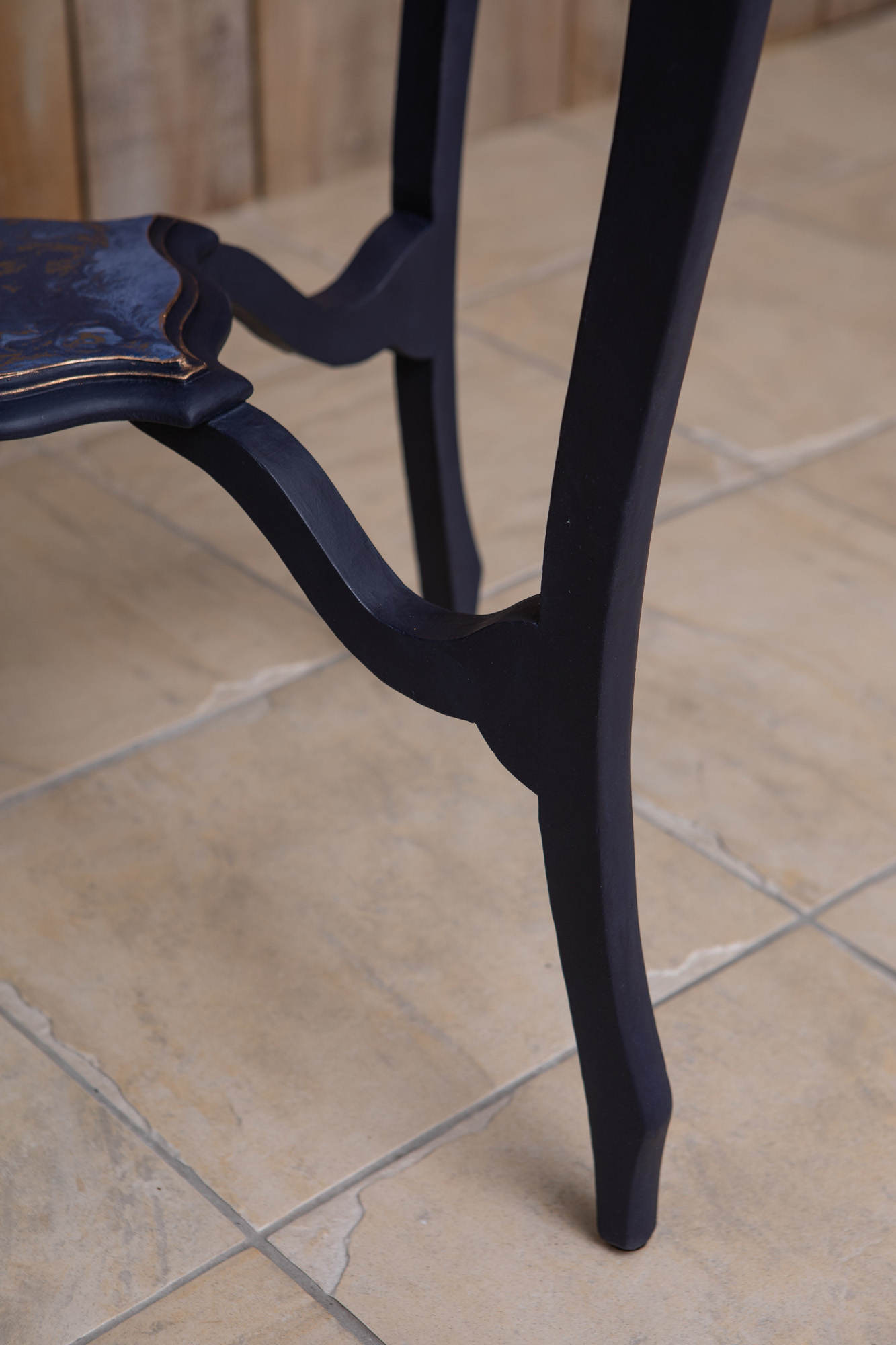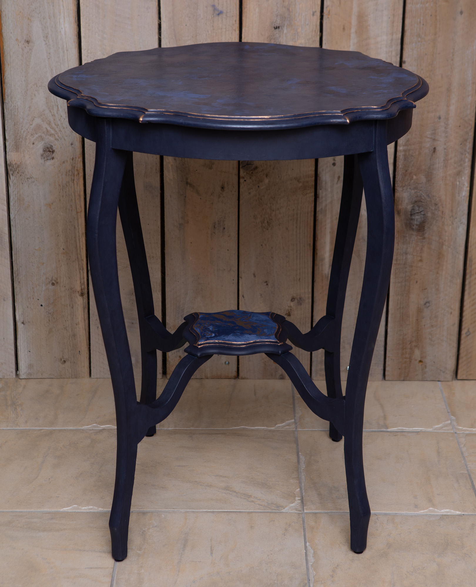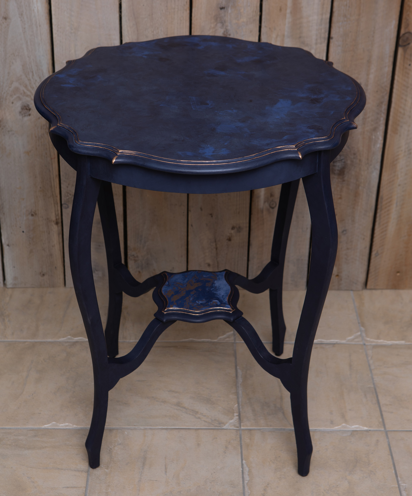 Lovely piece which works as a side table, plant stand or lamp table. Painted in Annie Sloan Oxford Navy with clear & black wax protection, this piece also has lots of gold gilt detailing and marble-effect paper inlaid onto the lower shelf.
