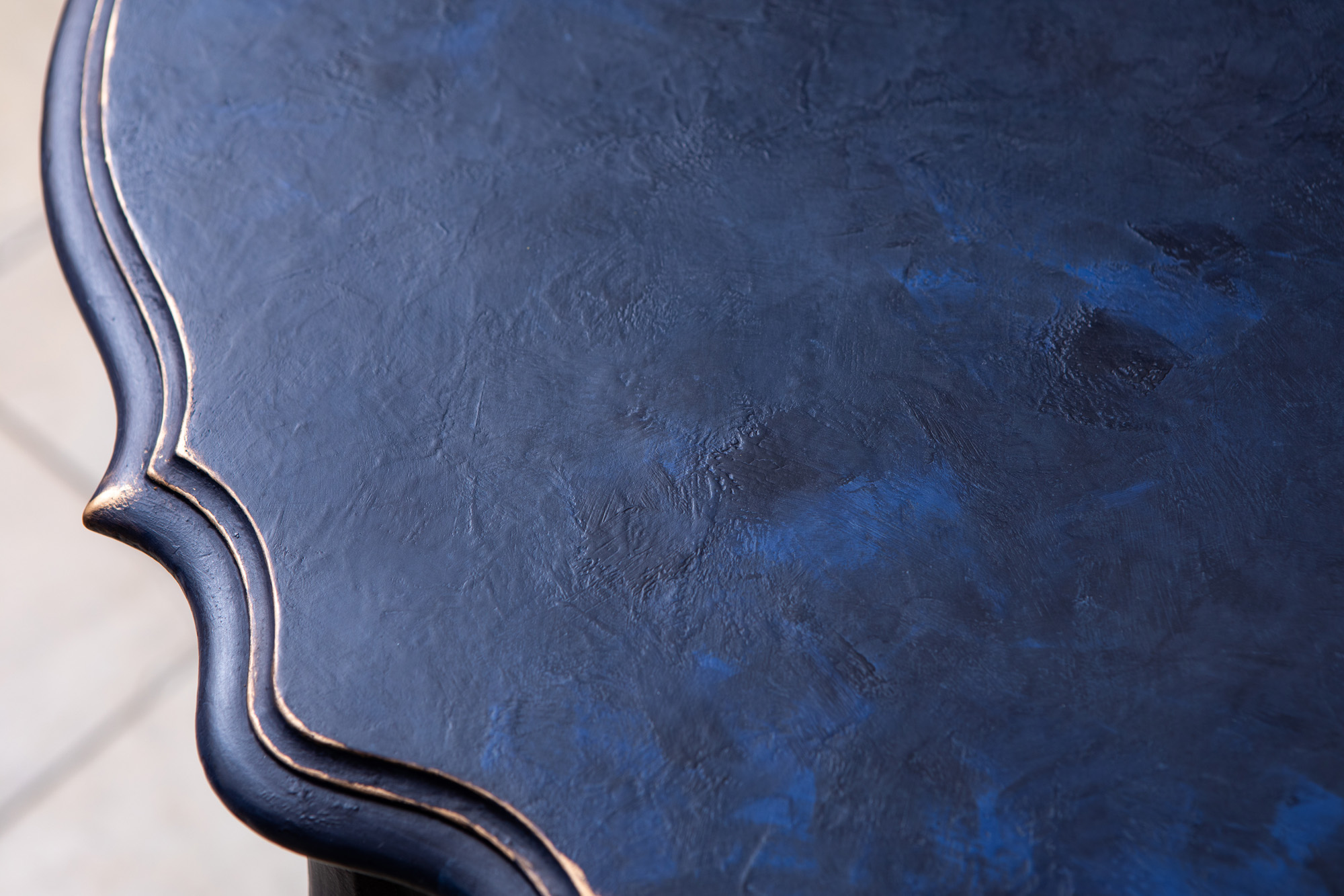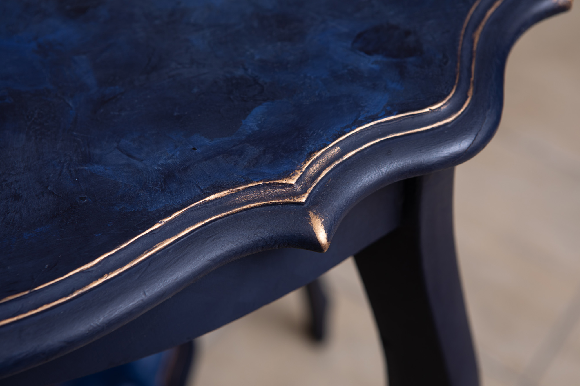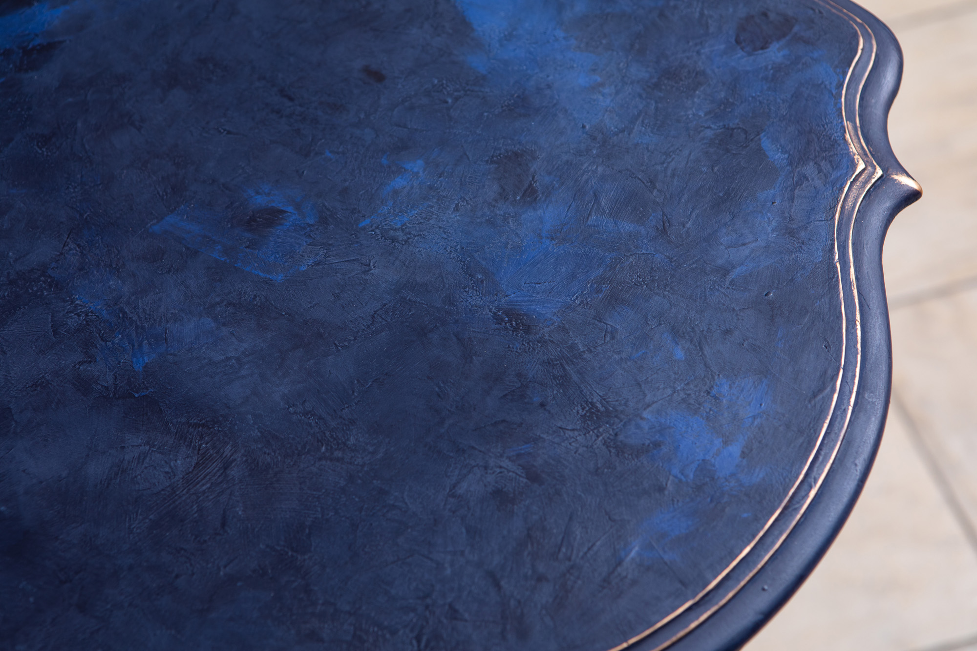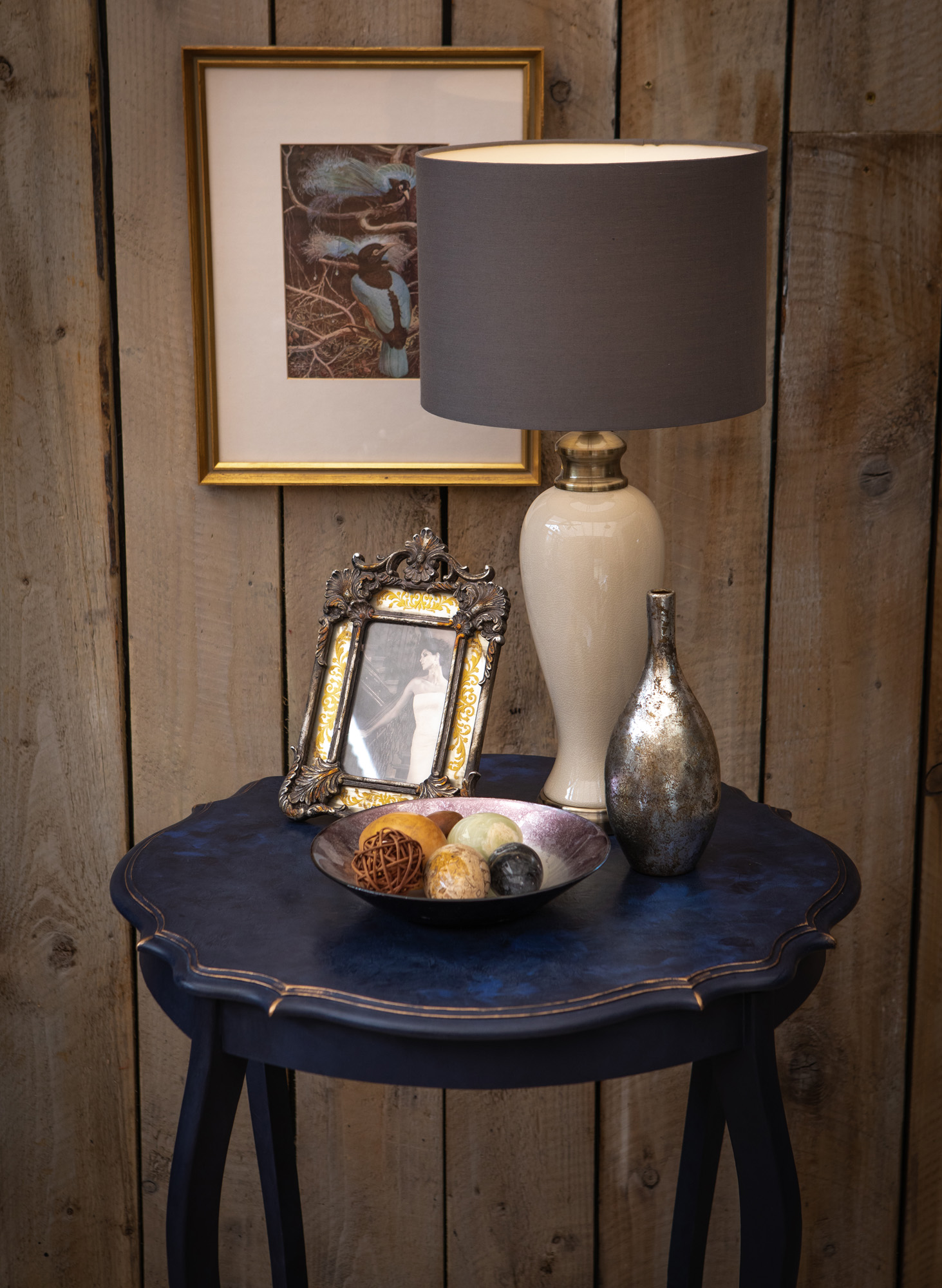 Lovely piece which works as a side table, plant stand or lamp table. Painted in Annie Sloan Oxford Navy with clear & black wax protection, this piece also has lots of gold gilt detailing and marble-effect paper inlaid onto the lower shelf.