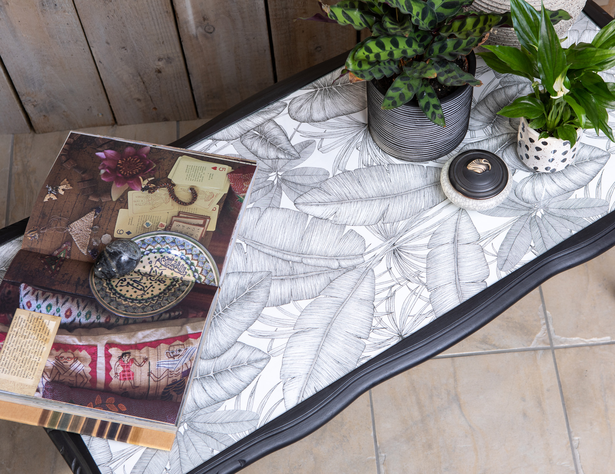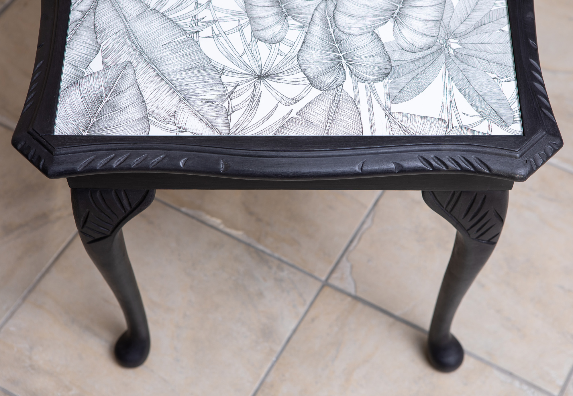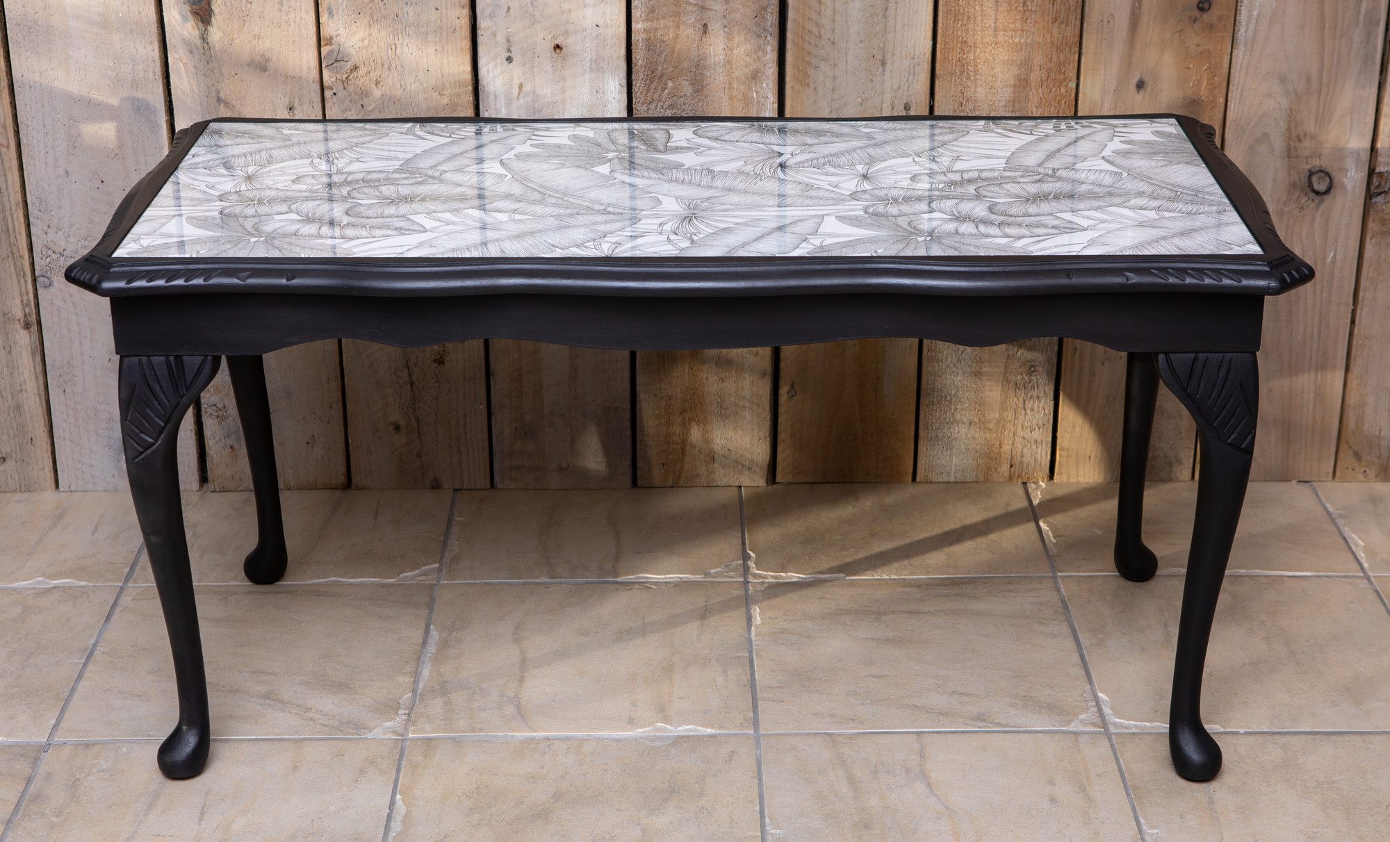 Celebrating jungle foliage with a contemporary monochrome vibe, this coffee table has been refurbished and fitted with a toughened glass top. The wooden table has been painted black and professionally finished with clear and black wax.