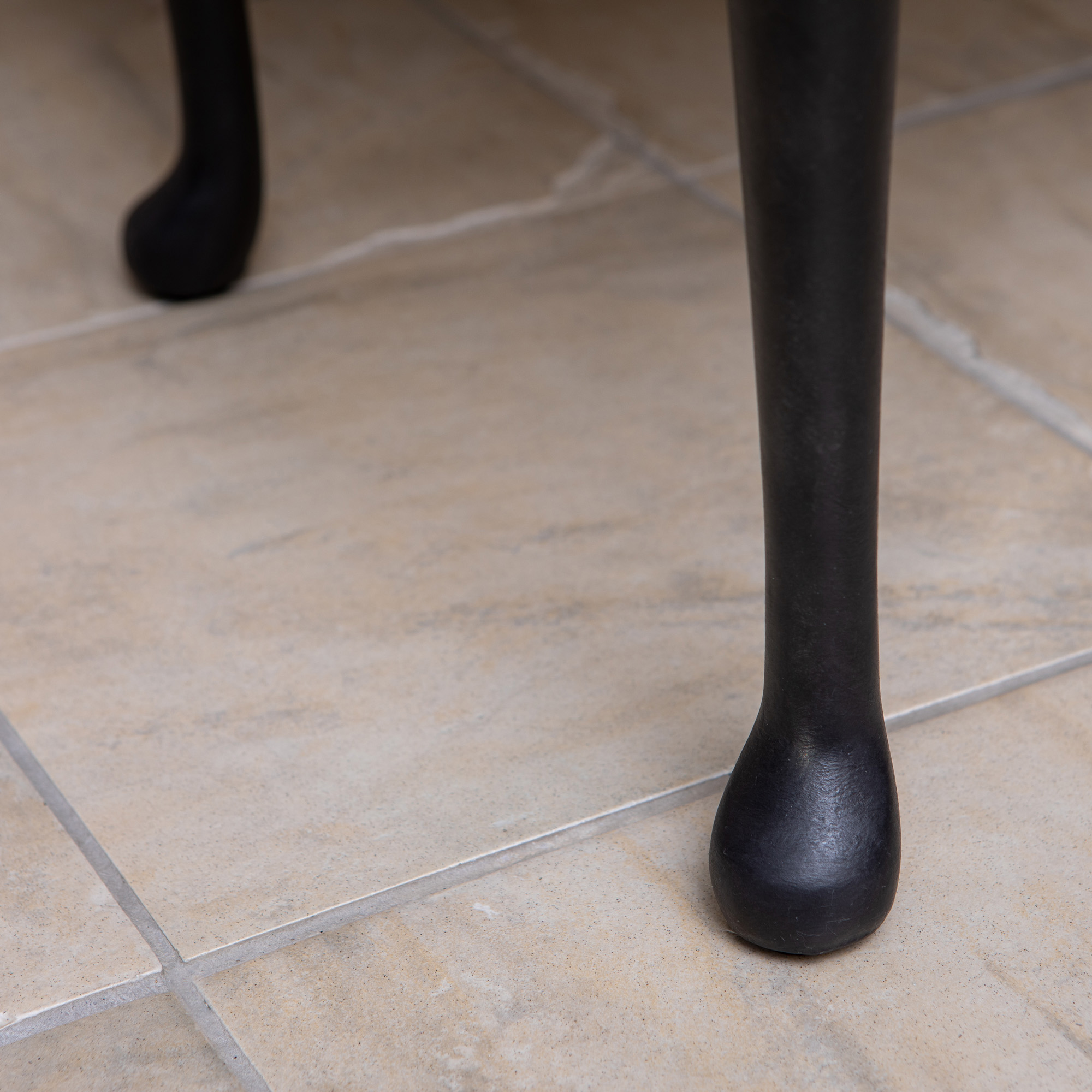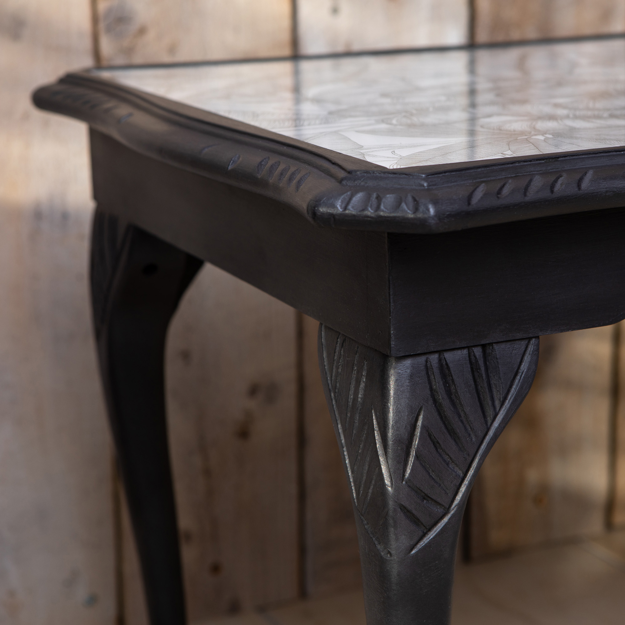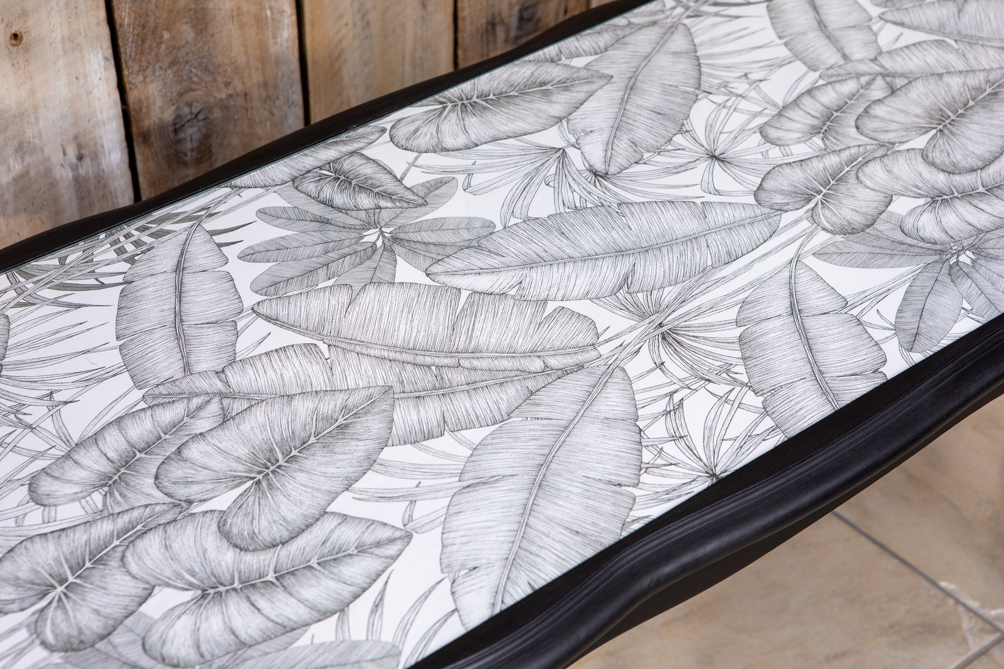 Celebrating jungle foliage with a contemporary monochrome vibe, this coffee table has been refurbished and fitted with a toughened glass top. The wooden table has been painted black and professionally finished with clear and black wax.