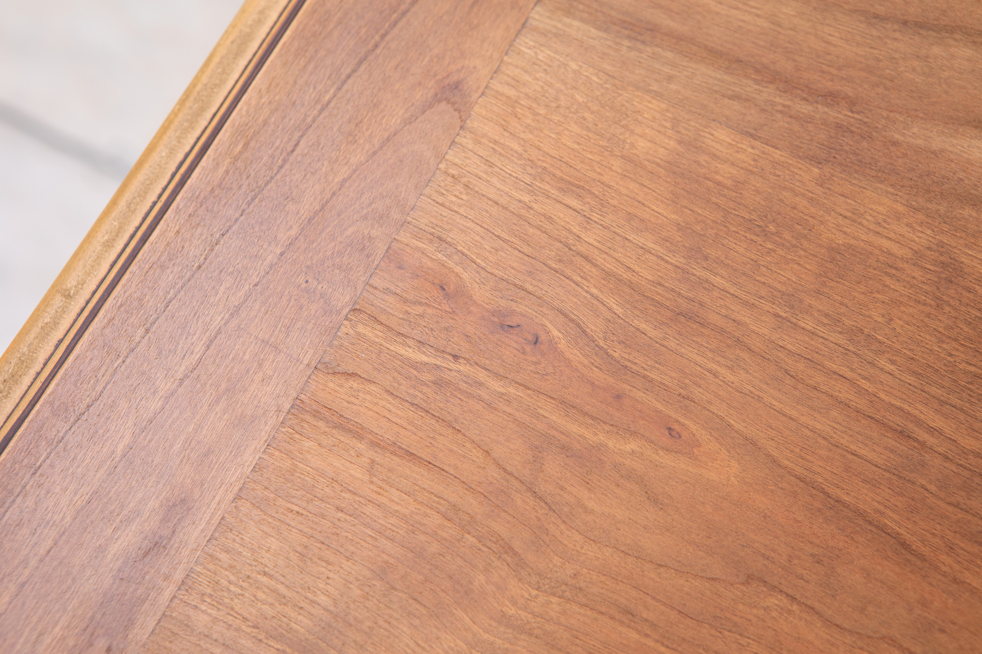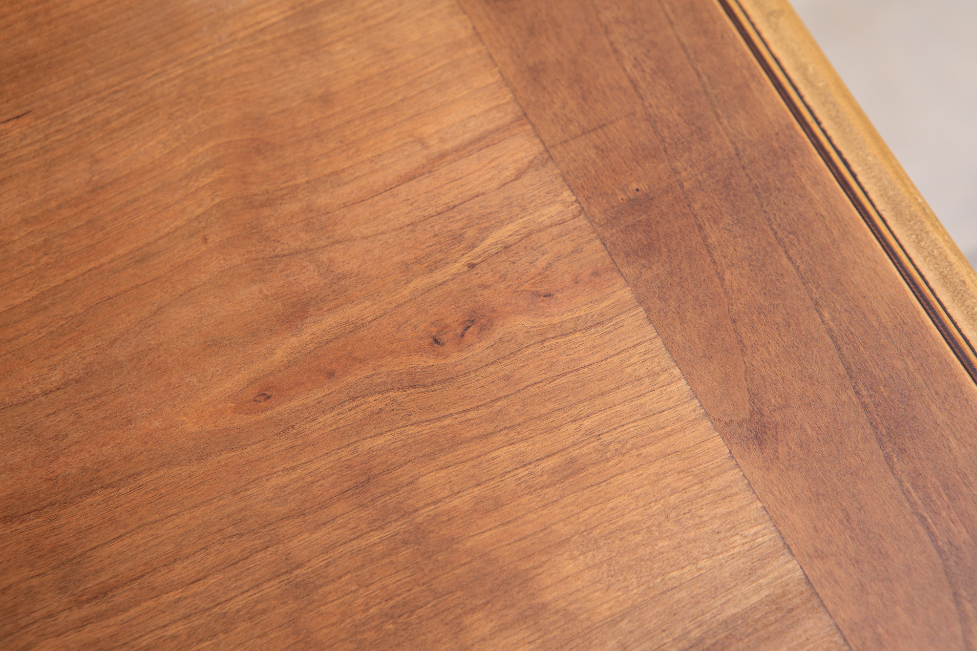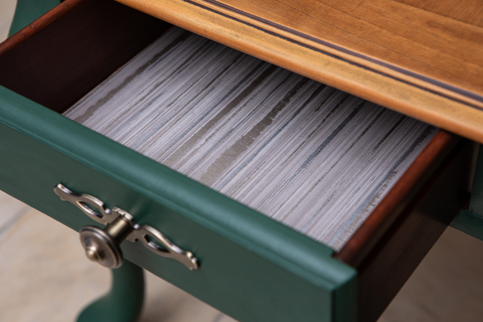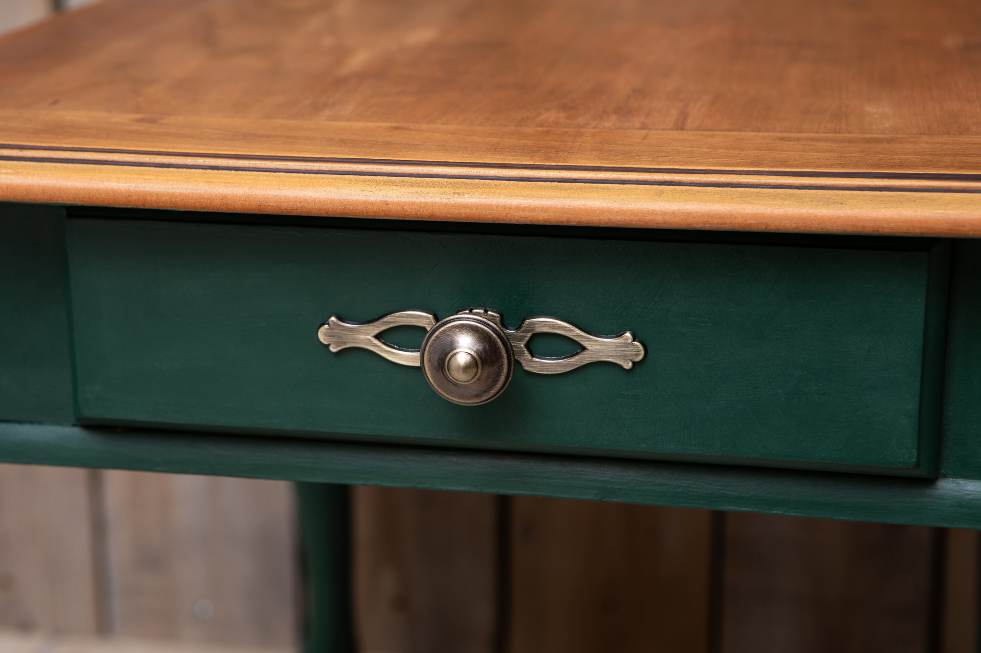After starting its life with us in a heavy lacquer finish, the wood was sanded back and the legs were given a new lease of life with Amsterdam Green Annie Sloan paint. The paintwork was waxed to seal it and ensure long term protection. Generous coats of oak coloured beeswax protect the table top. A new handle and a decoupaged base to the drawer finished the transformation.