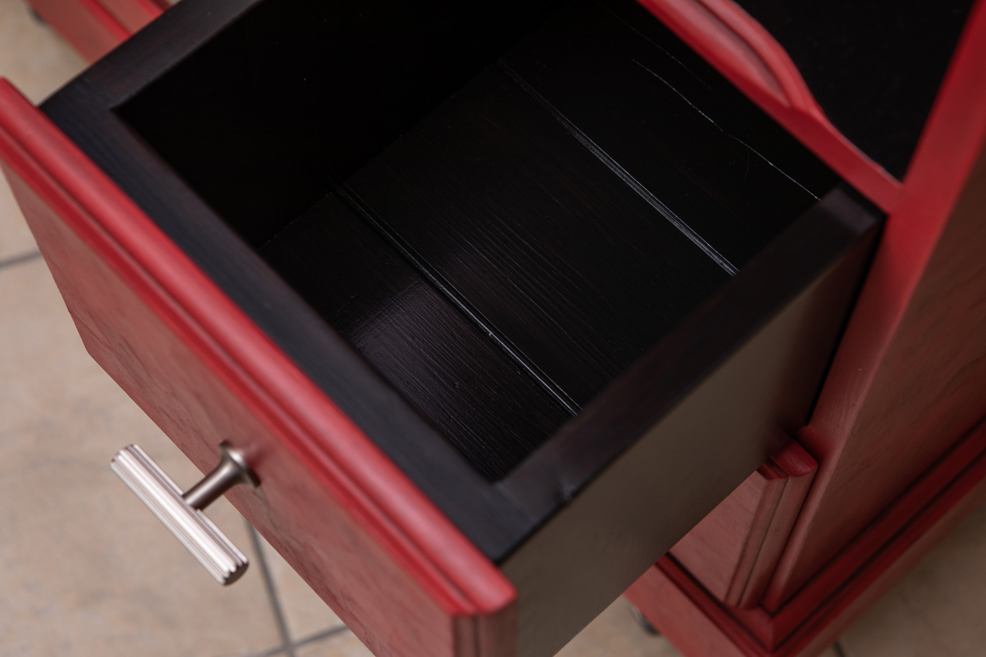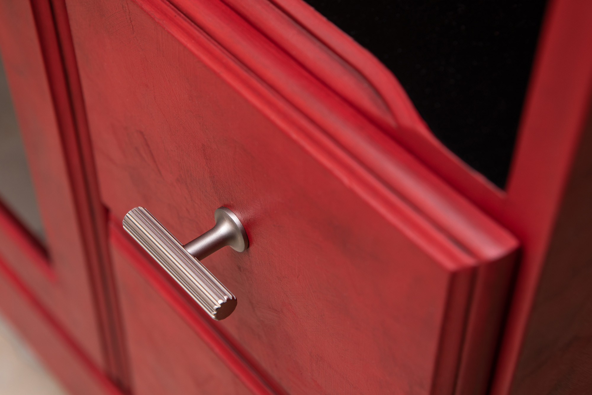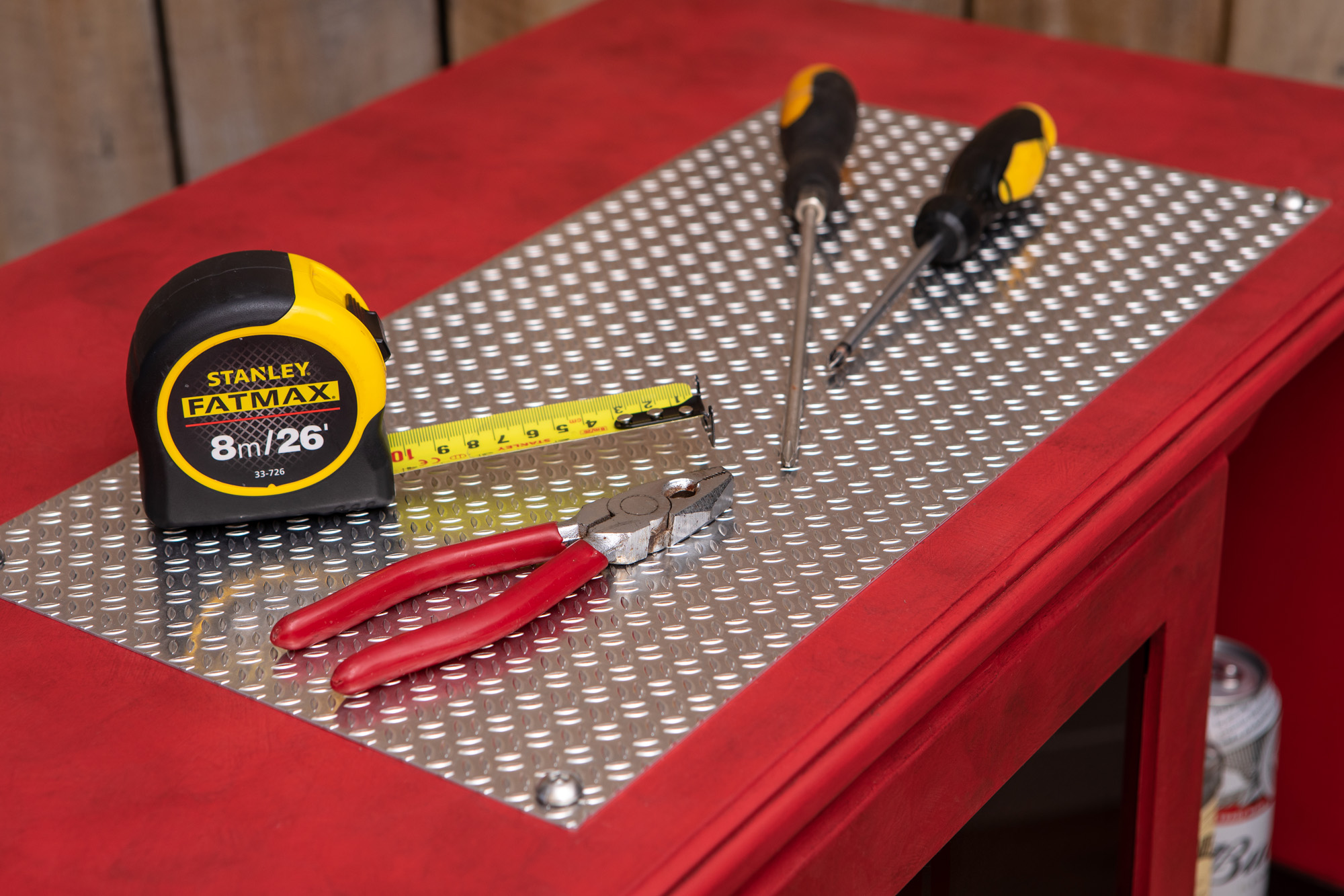 Painted in Emperor’s Silk Annie Sloan chalk paint, skilful application of dark wax has created a unique patina on this cabinet. Finished with a combination of specialist waxes to protect, seal and texturise the design, we’ve also added metal chequer plate and drilled aluminium panels to create an unashamedly male-biased piece!