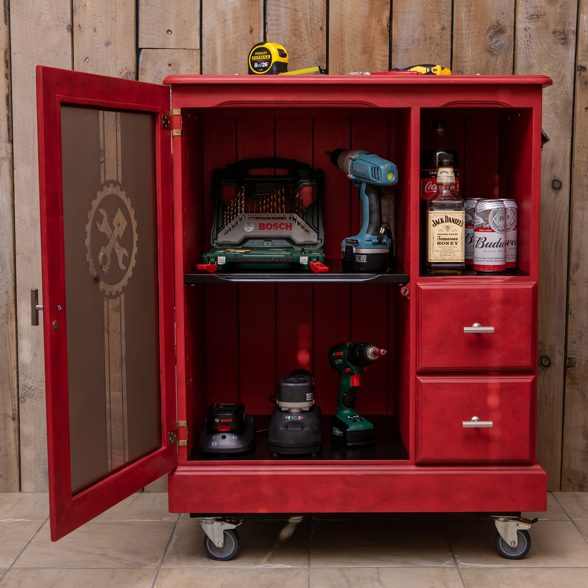 New handles throughout, including chunky side handles for moving the unit or as hanging bars, work with the large lockable castors to transform this piece into a functional utility unit. Perfect for everything from a home office through to a man-cave or workshop. The ‘Esso’ bottle opener is sure to be well used in all these environments!