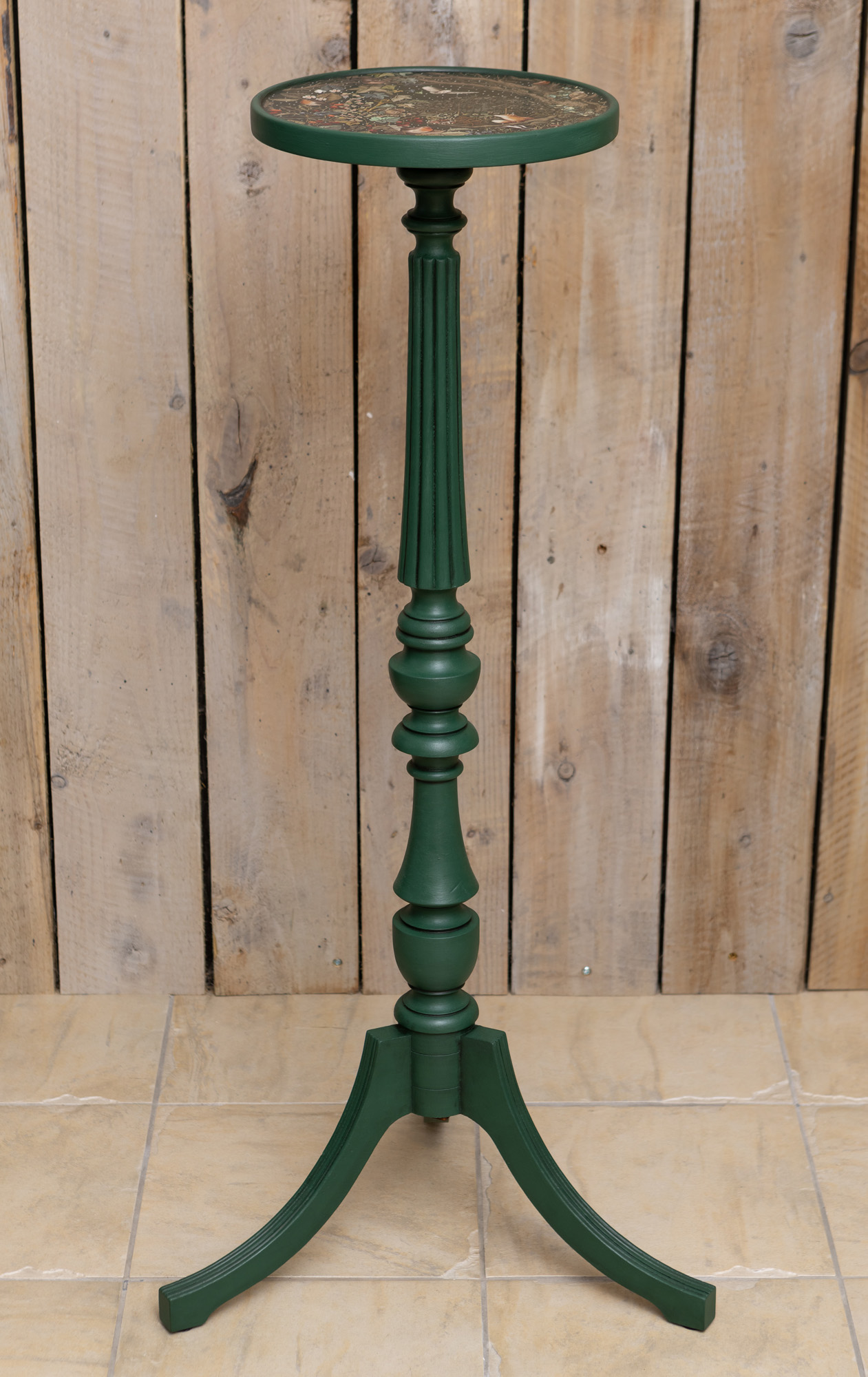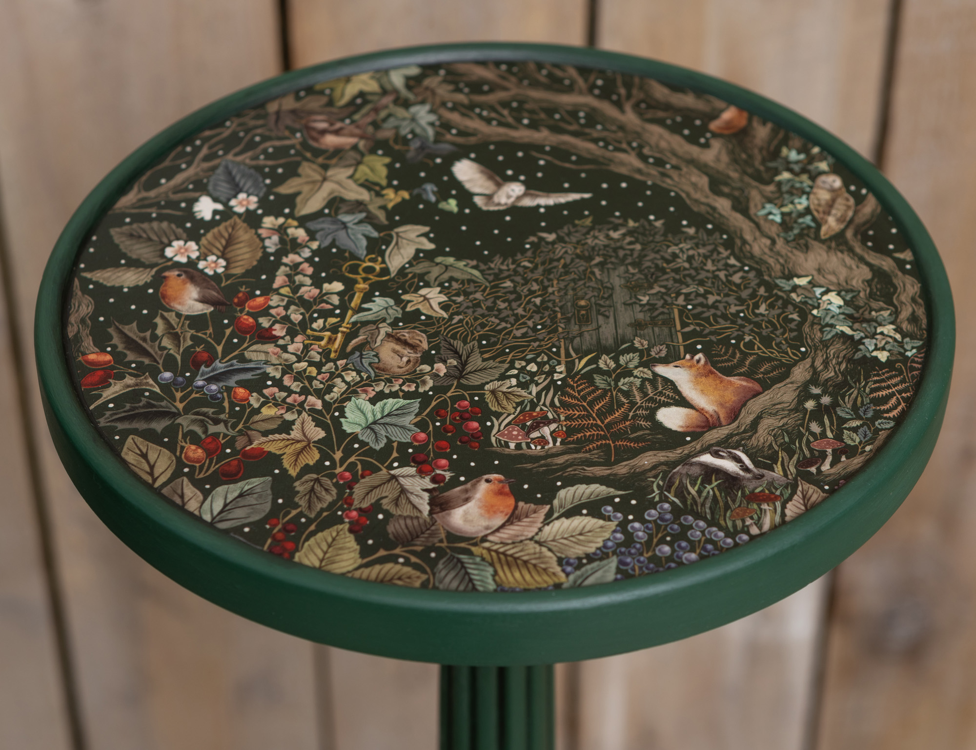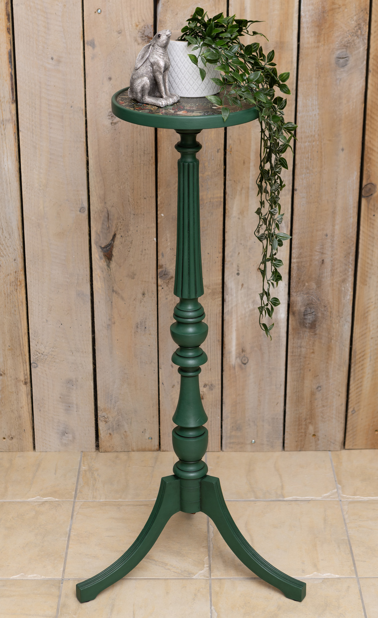 Plant stands have been experiencing something of a resurgence in popularity, and we carefully restored this one to it’s former glory. Painted in Amsterdam Green Annie Sloan chalk paint, finished with black and clear wax to protect & seal, this elegant plant stand then had the the top decorated with stunning Winter Woodland paper decoupage.